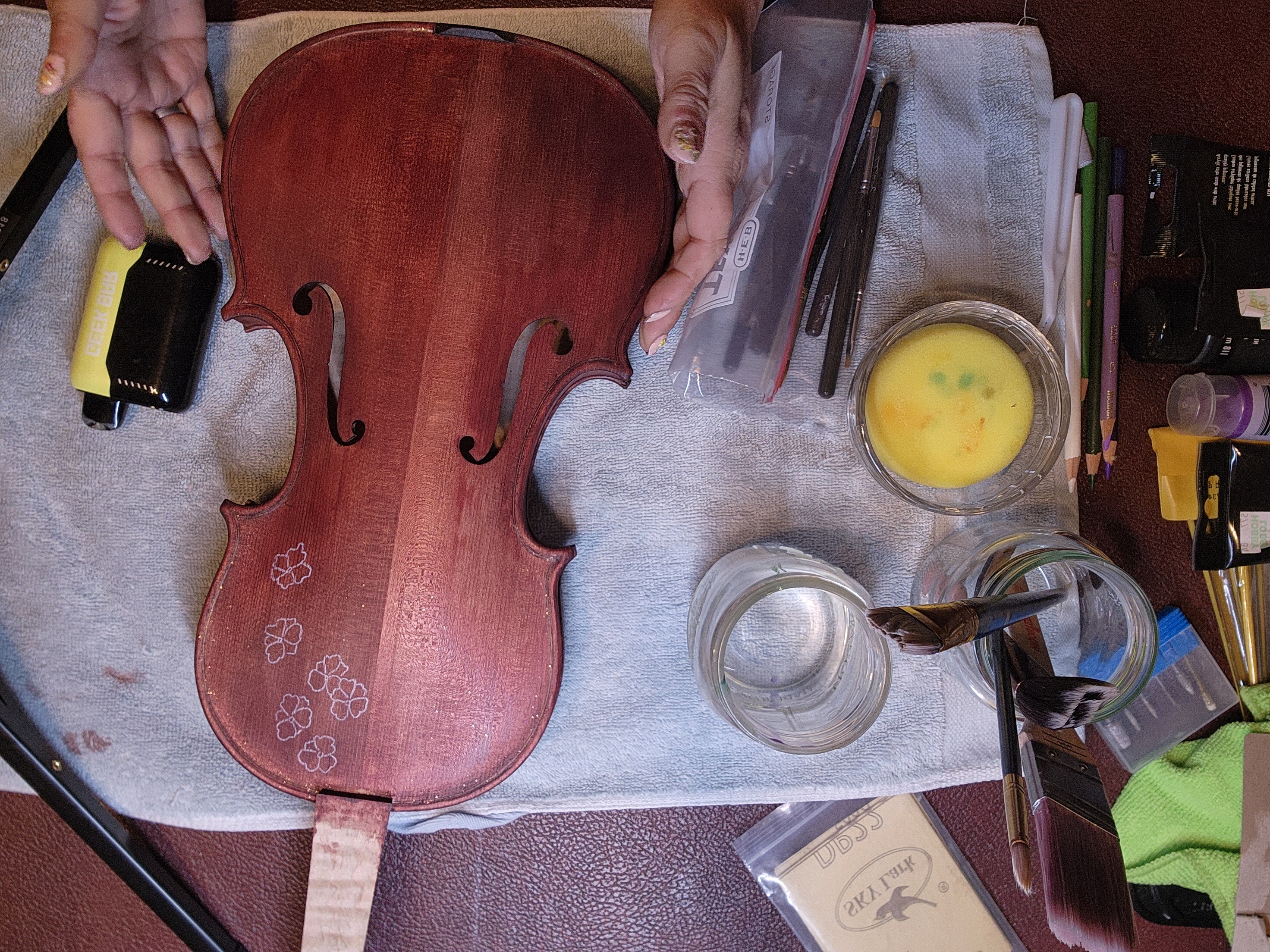 I test wood stains and finishes and design each violin for its unique potential. The details of the designs are important to me, though the most critical is how the violin sounds and plays.