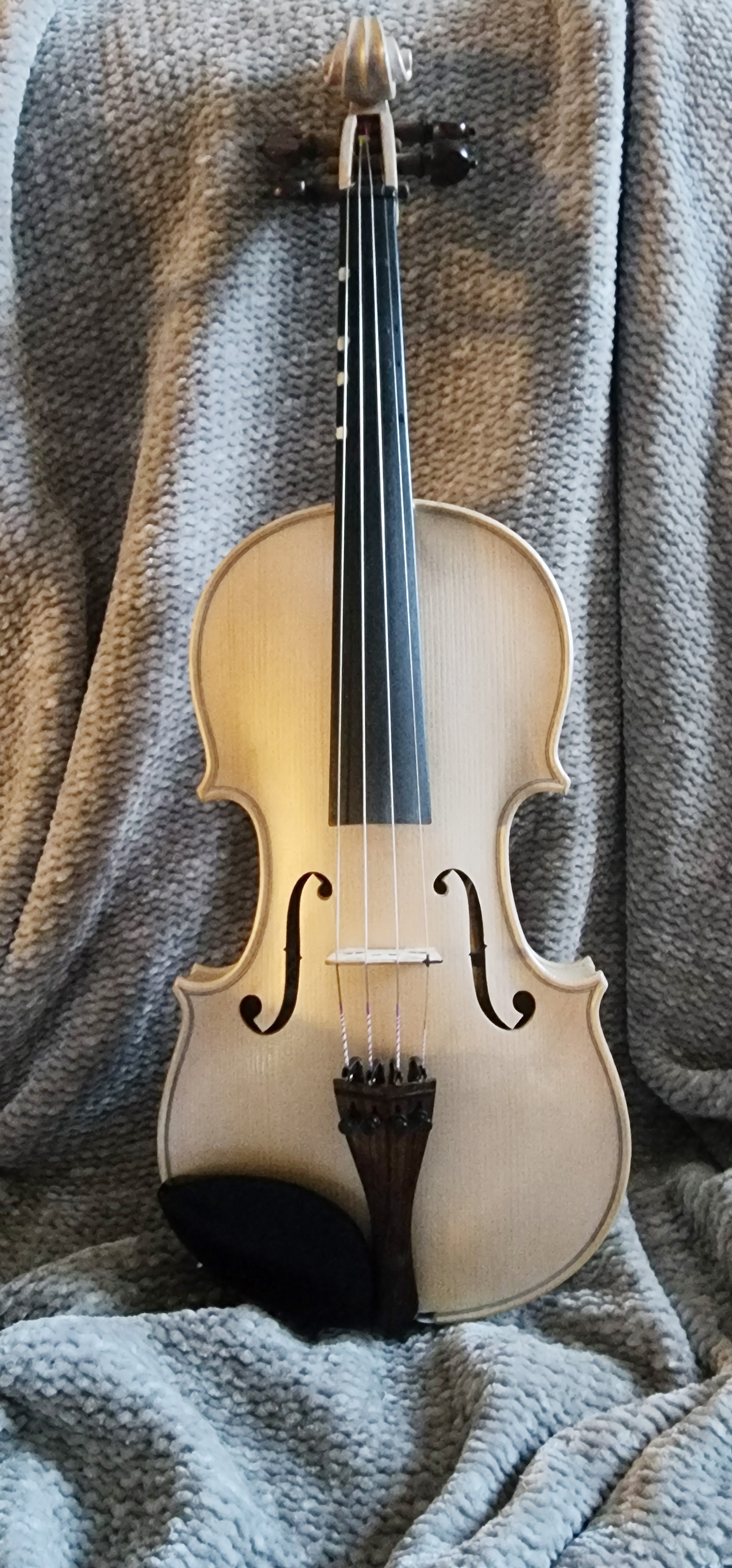 I purchase unfinished violins in the best woods from a maker with over 25-years of experience. The top plates are made of old spruce and the sides and back plate are Tiger Flame Maple. Fingerboards and the nut are Ebony.
